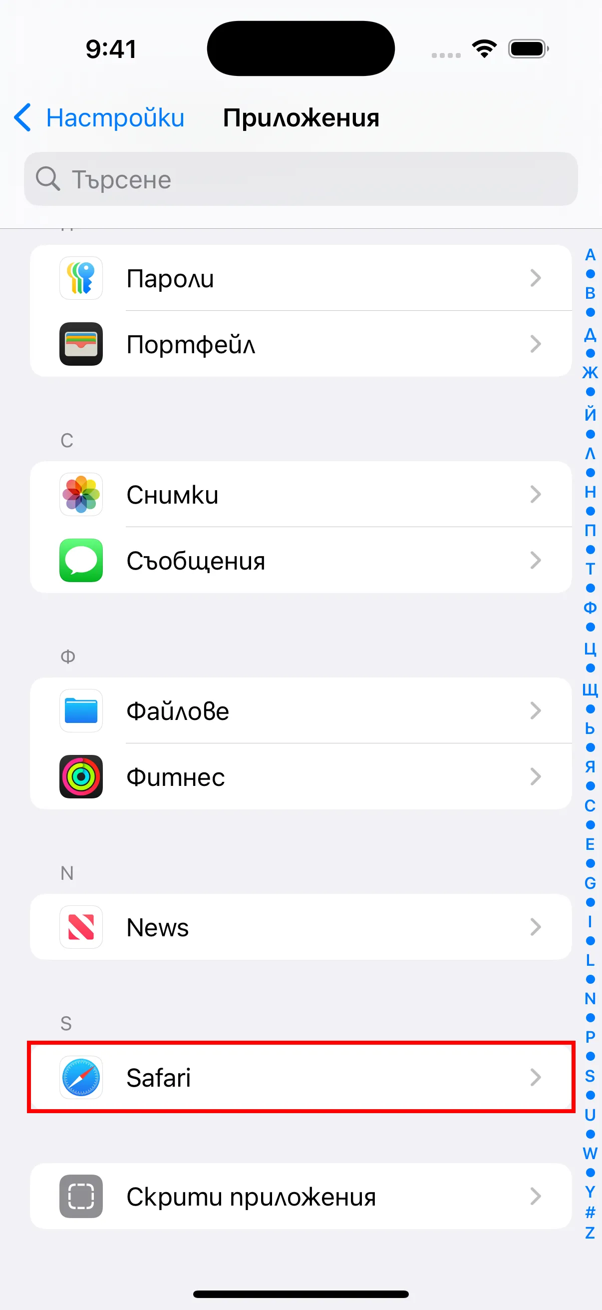 - Намерете и натиснете “Safari” в списъка с приложения.