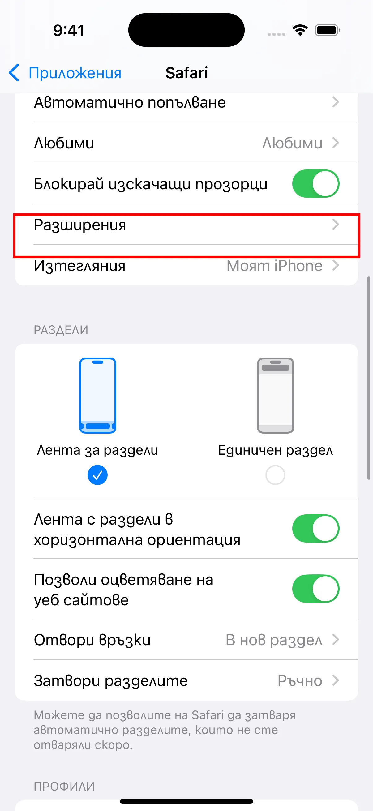 - Върнете се към настройките на Safari, натиснете “Разширения.”