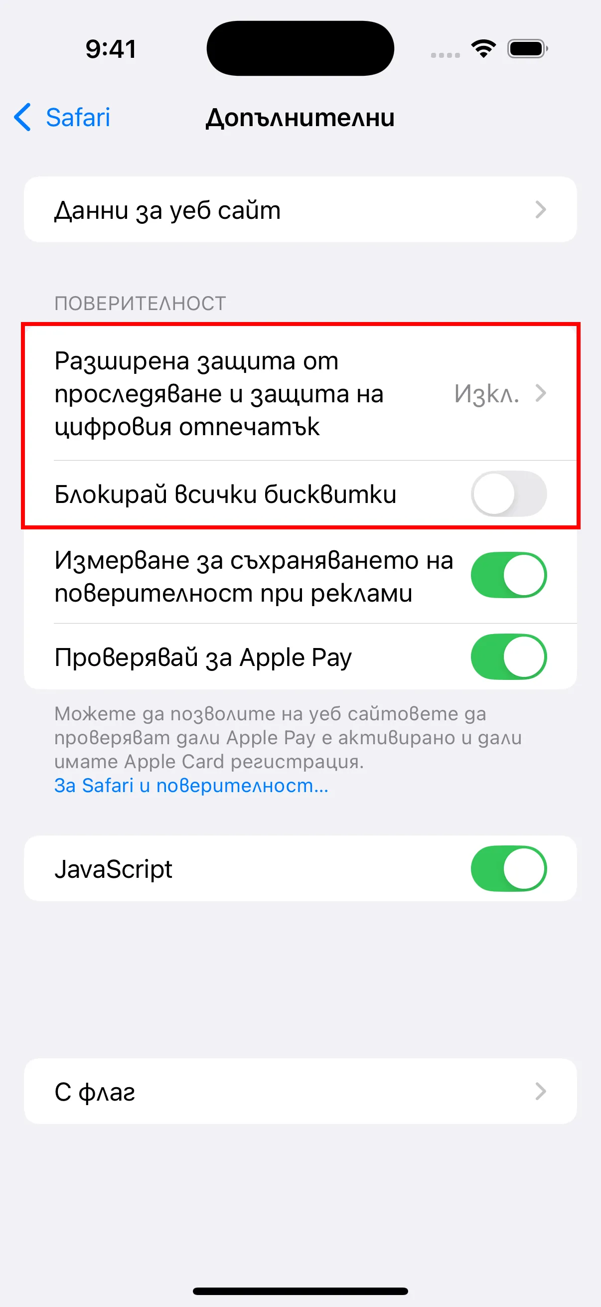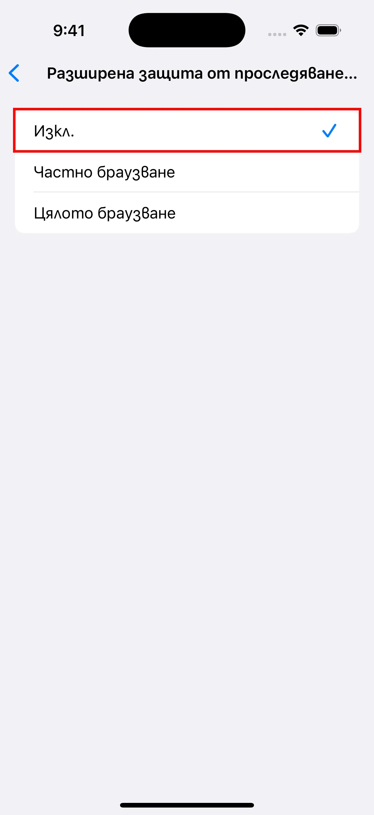 - В Разширени настройки натиснете “Разширена защита от проследяване и защита на цифровия отпечатък” и го задайте на Изкл.. Също така се уверете, че “Блокирай всички бисквитки” е изключено.