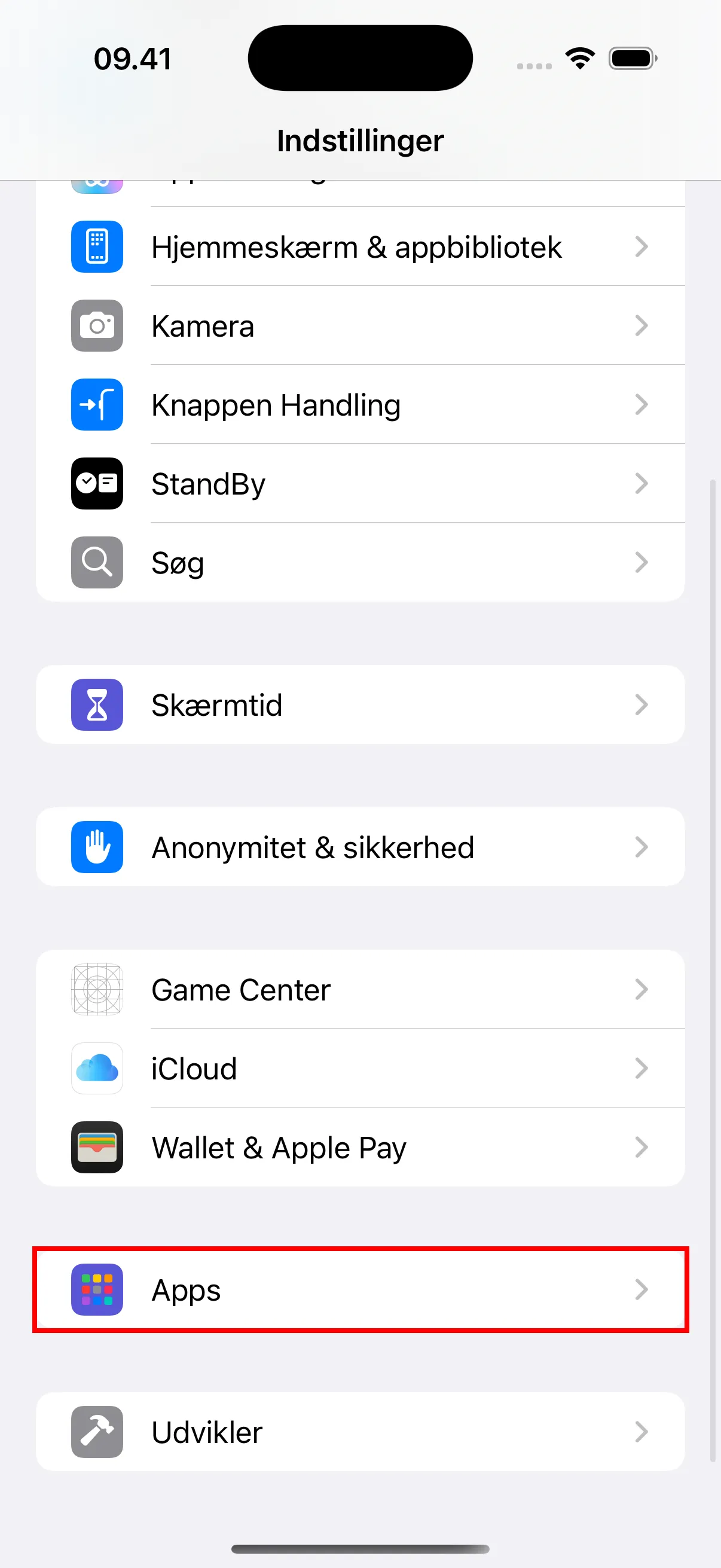 - Åbn appen “Indstillinger” på din iPhone, rul ned for at finde “Apps” og tryk for at åbne.