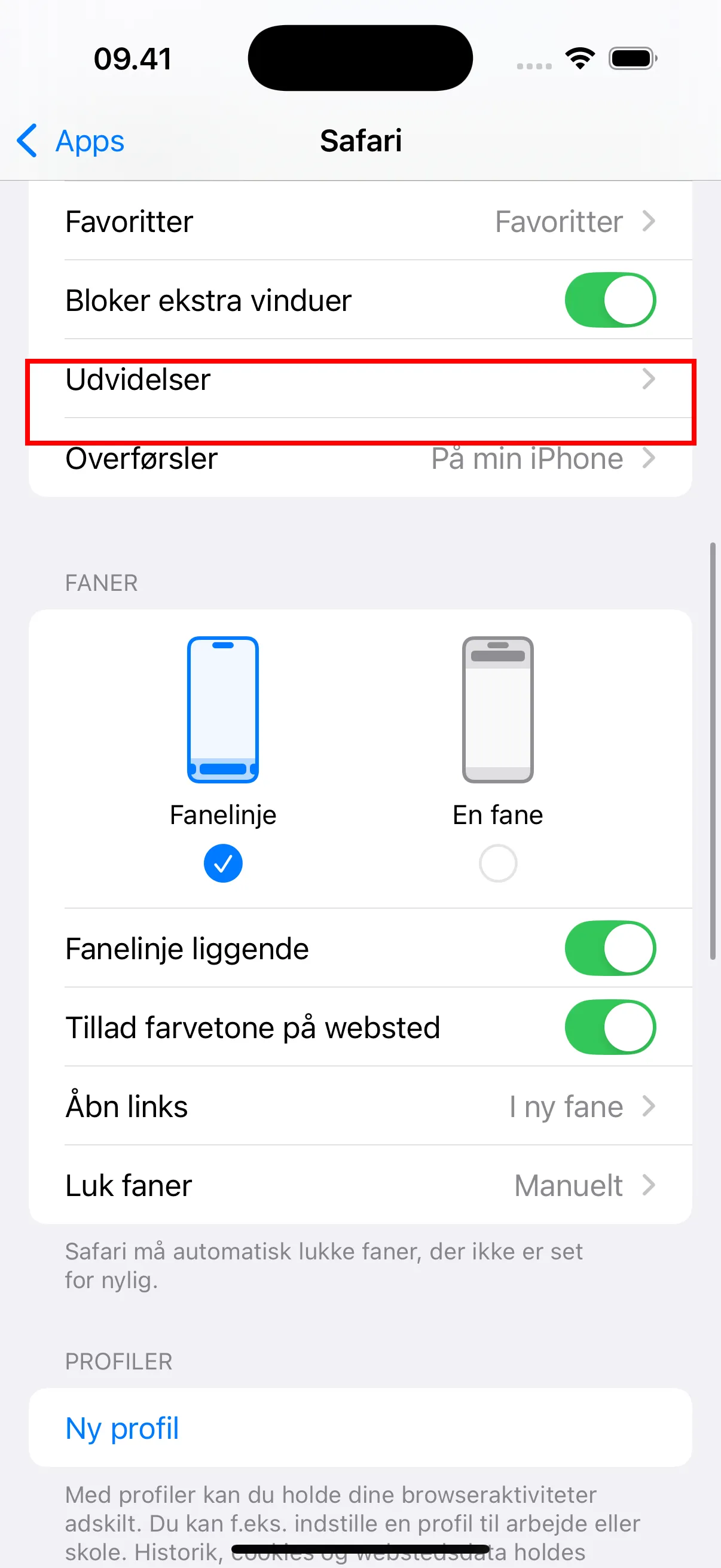 - I Safari-indstillingerne skal du sørge for, at “Blokér pop-ups” er aktiveret. Bemærk også muligheden “Udvidelser” — du skal aktivere udvidelser her efter installation af pluginet.