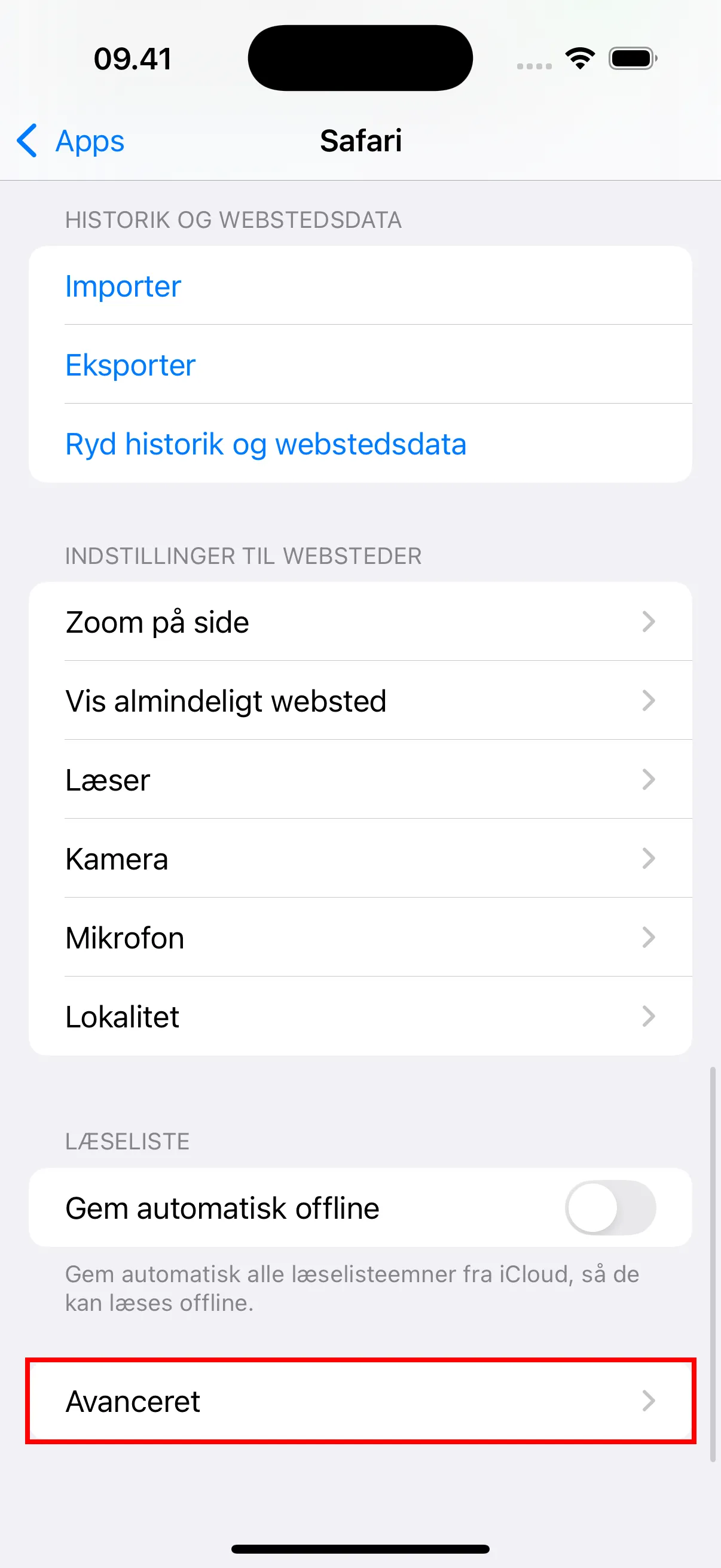 - Rul ned til bunden og tryk på “Avanceret” for at åbne avancerede indstillinger.