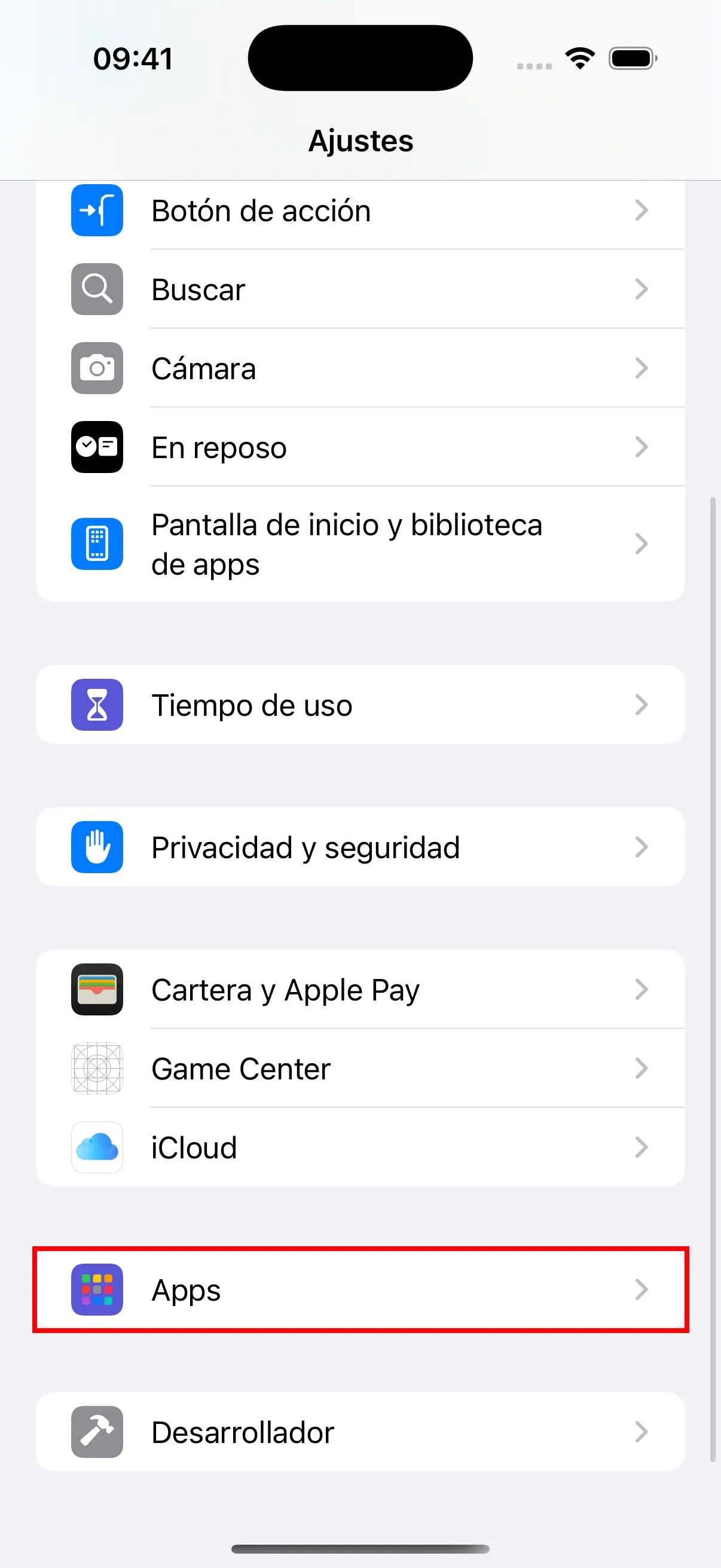 - Abre la aplicacion “Ajustes” en tu iPhone, desplazate hacia abajo para encontrar “Apps” y toca para entrar.
