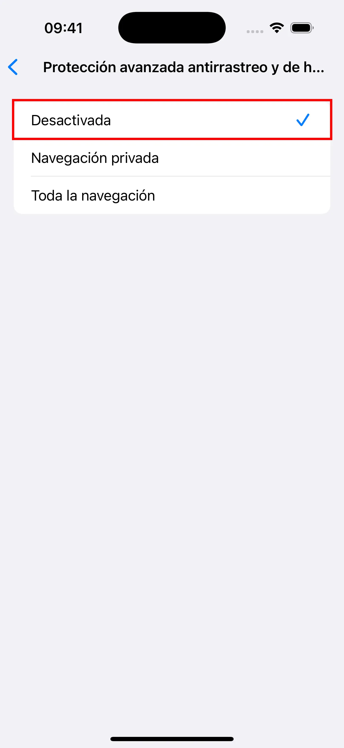 - En los ajustes avanzados, toca “Proteccion avanzada de rastreo y huellas digitales” y configuralo en Desactivado. Tambien asegurate de que “Bloquear todas las cookies” este desactivado.