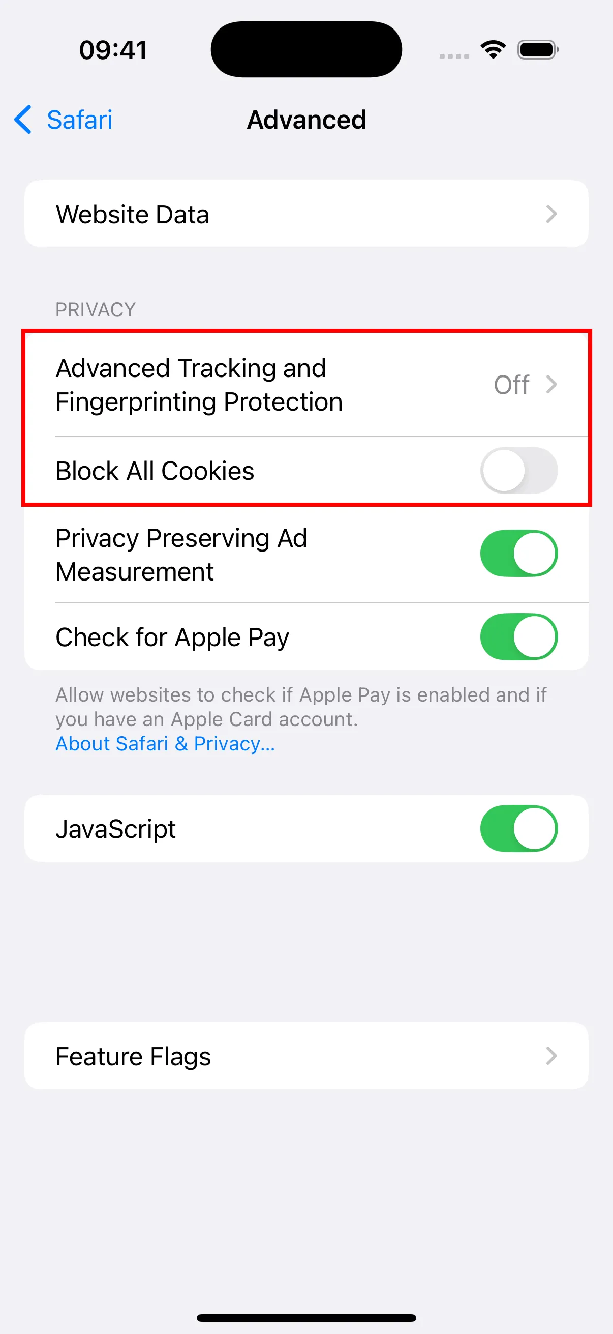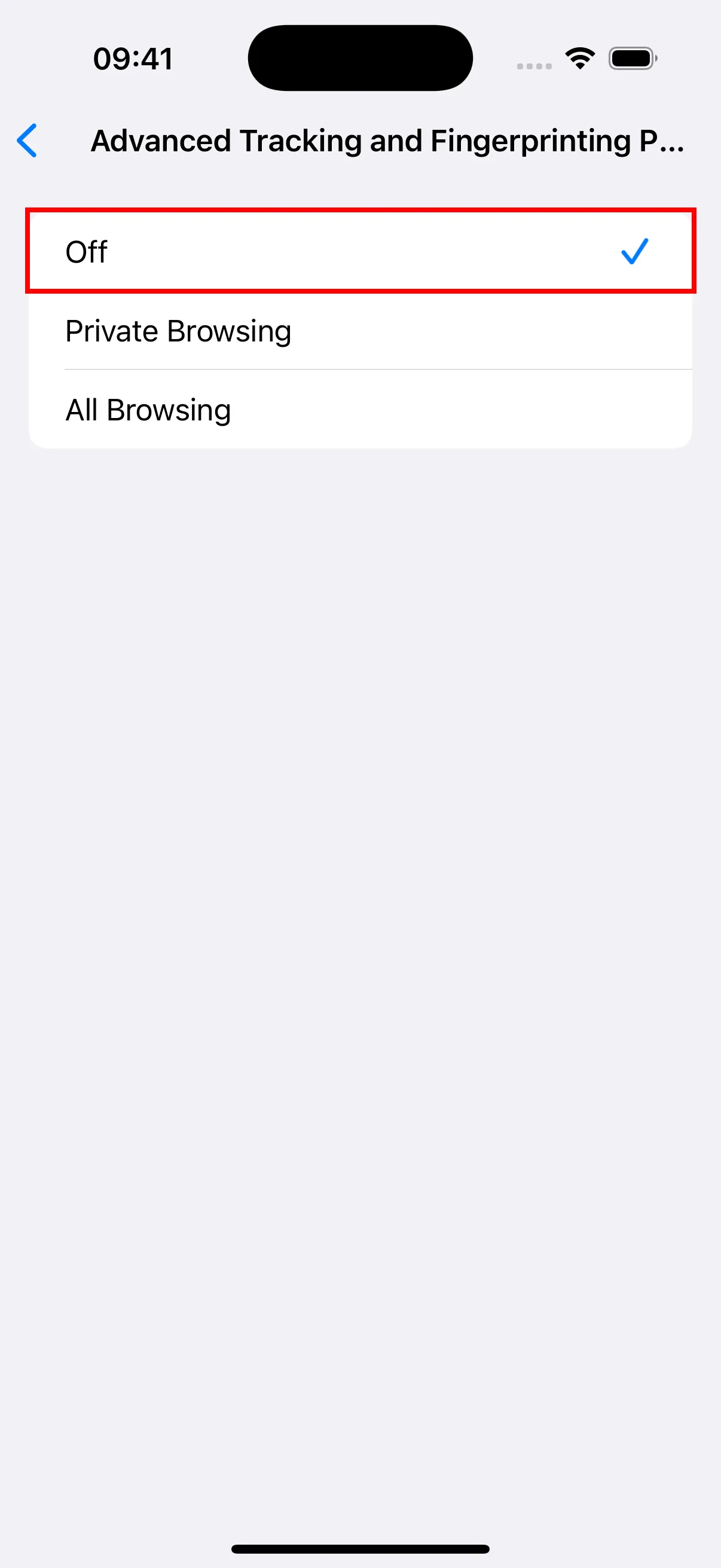 - Taeapiaerasema seadetes puuduta “Advanced Tracking and Fingerprinting Protection” ja seadista see Off. Veendu ka, et “Block All Cookies” on Off.