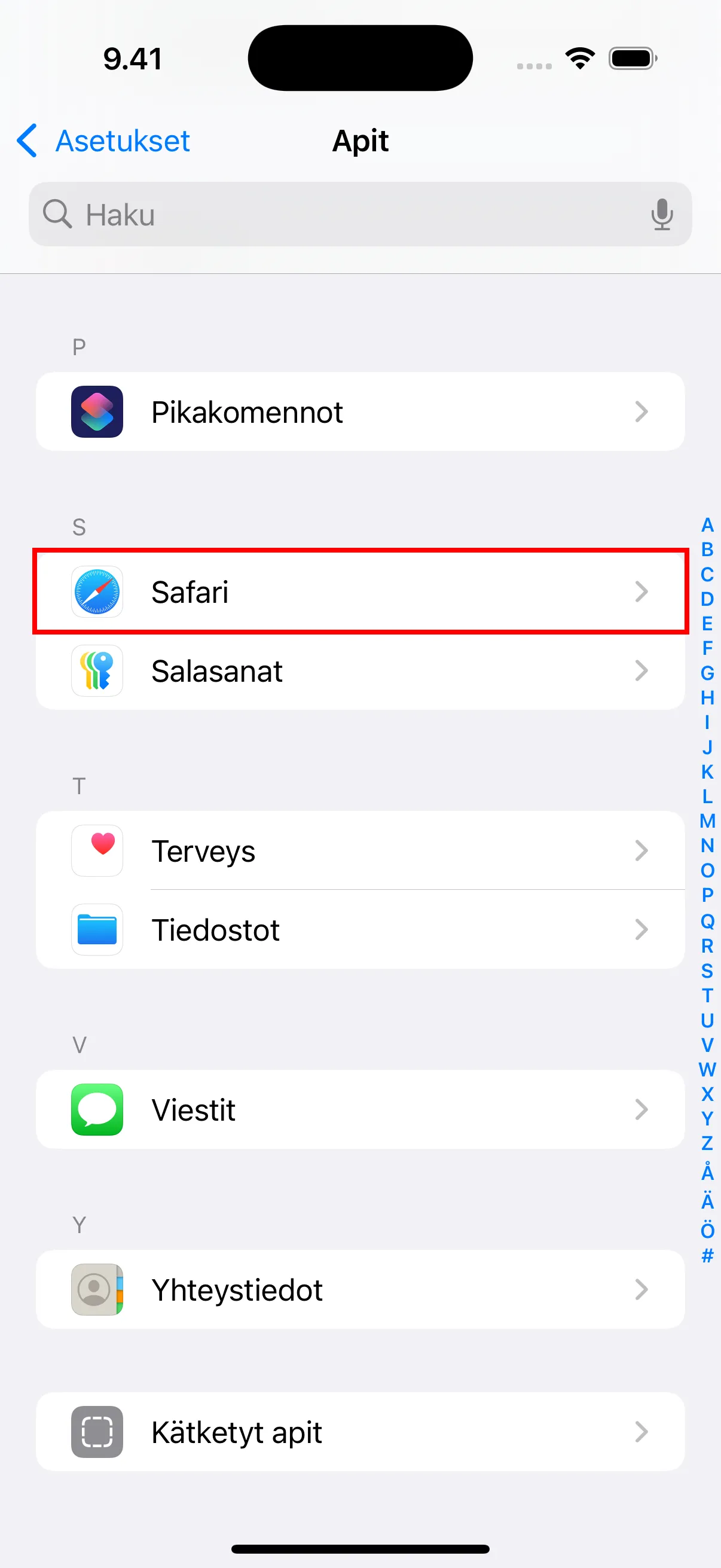 - Etsi ja napauta “Safari” Apit-luettelossa.