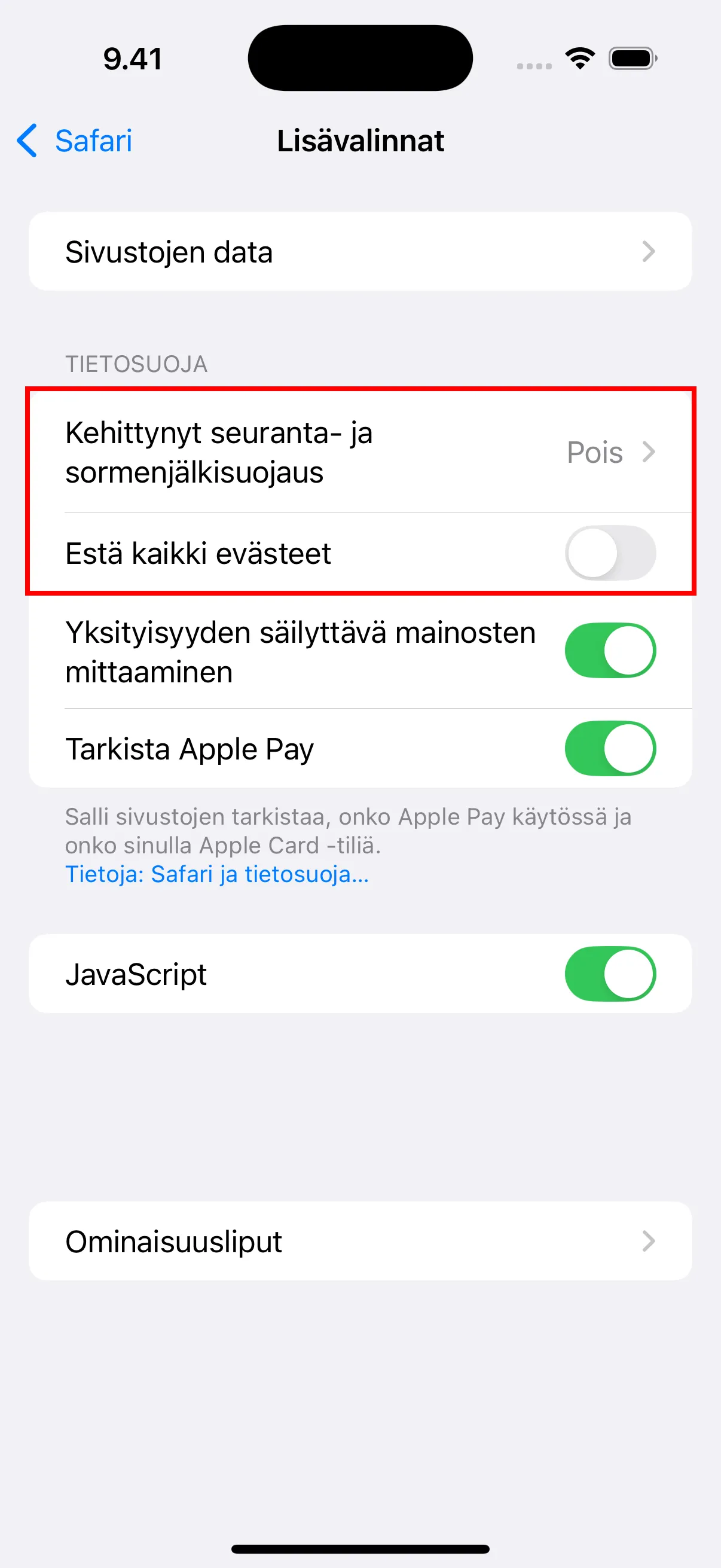- Lisävalinnoissa napauta “Kehittynyt seuranta- ja sormenjälkisuojaus” ja aseta se Pois. Varmista myos, etta “Estä kaikki evästeet” on Pois.