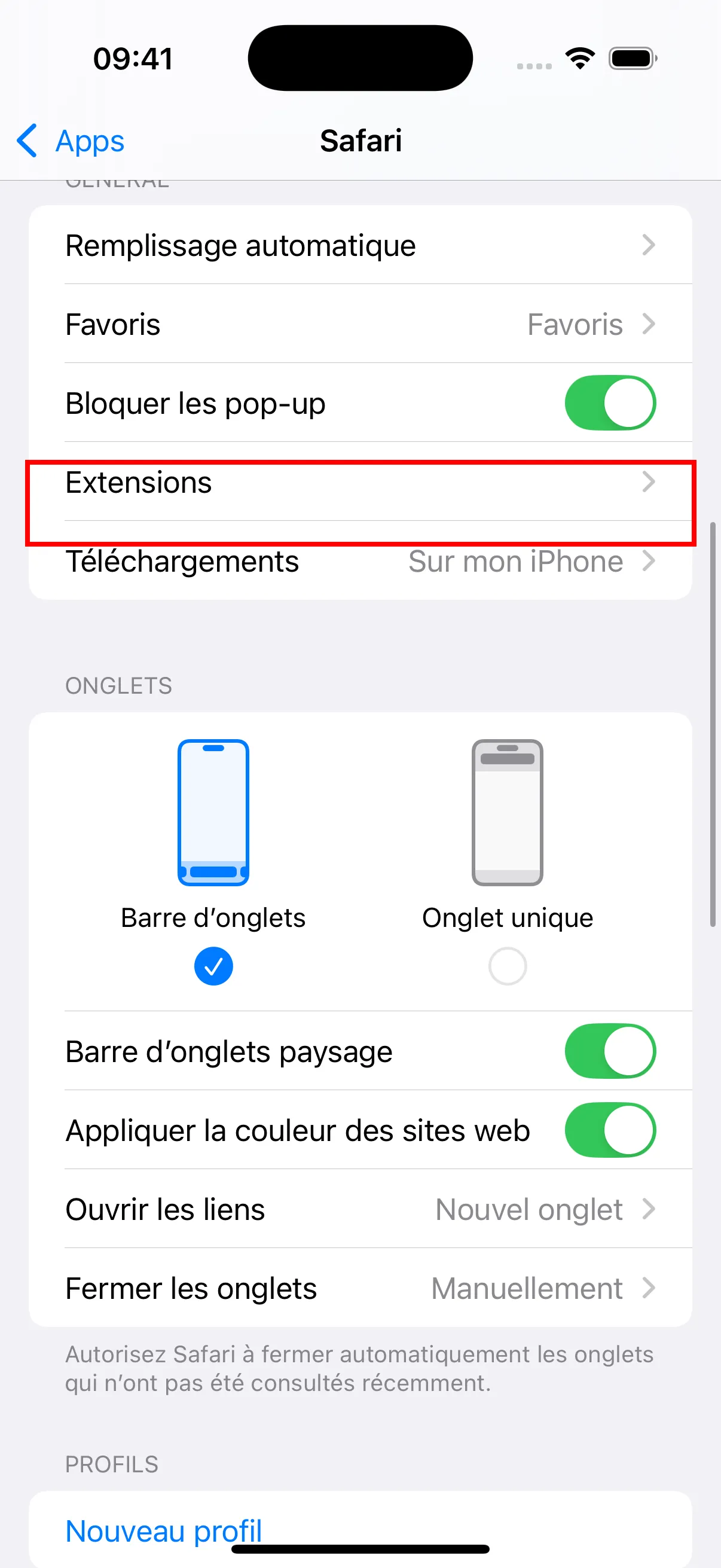 - Retournez aux reglages de Safari, appuyez sur “Extensions.”
