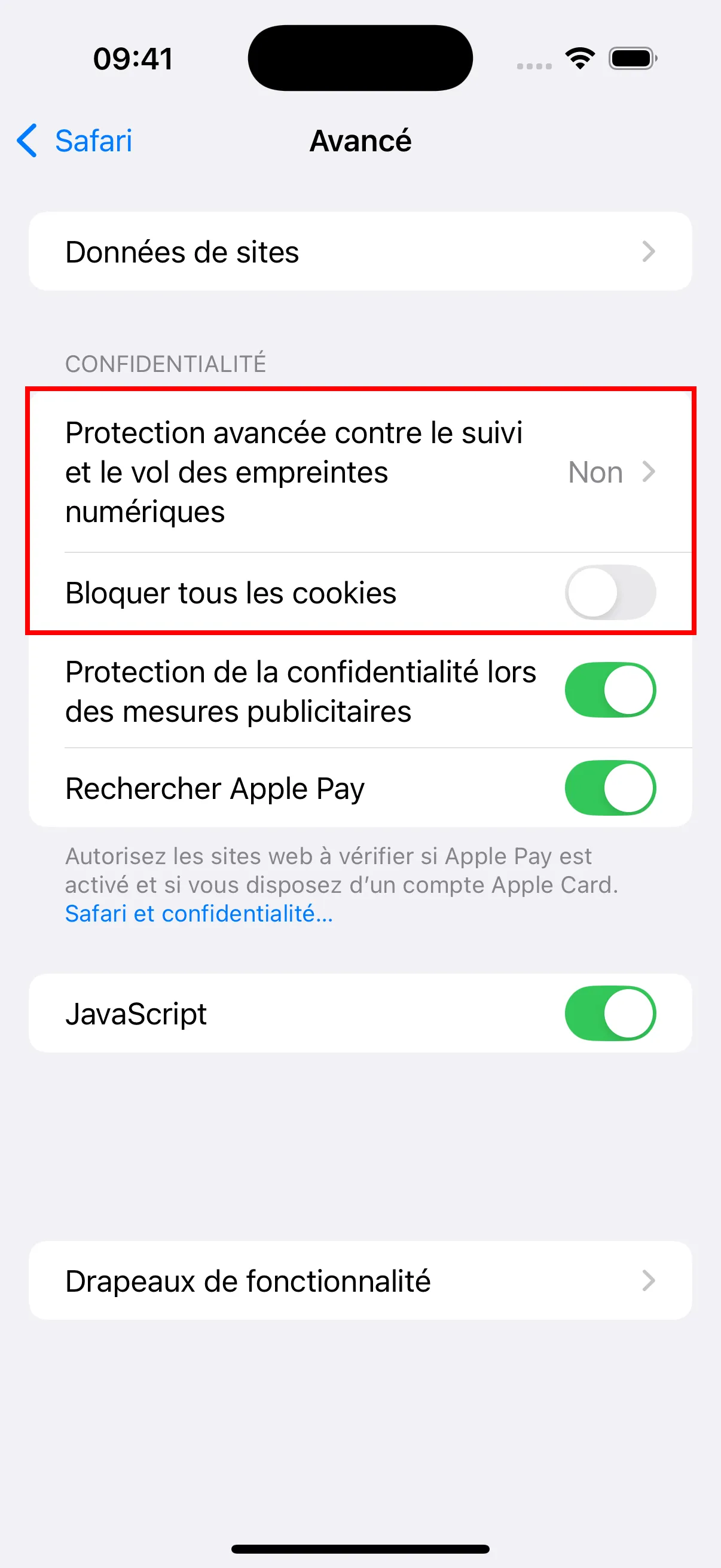 - Dans les reglages avances, appuyez sur “Protection avancée contre le suivi et le vol des empreintes numériques” et reglez-le sur Non. Assurez-vous egalement que “Bloquer tous les cookies” est Non.