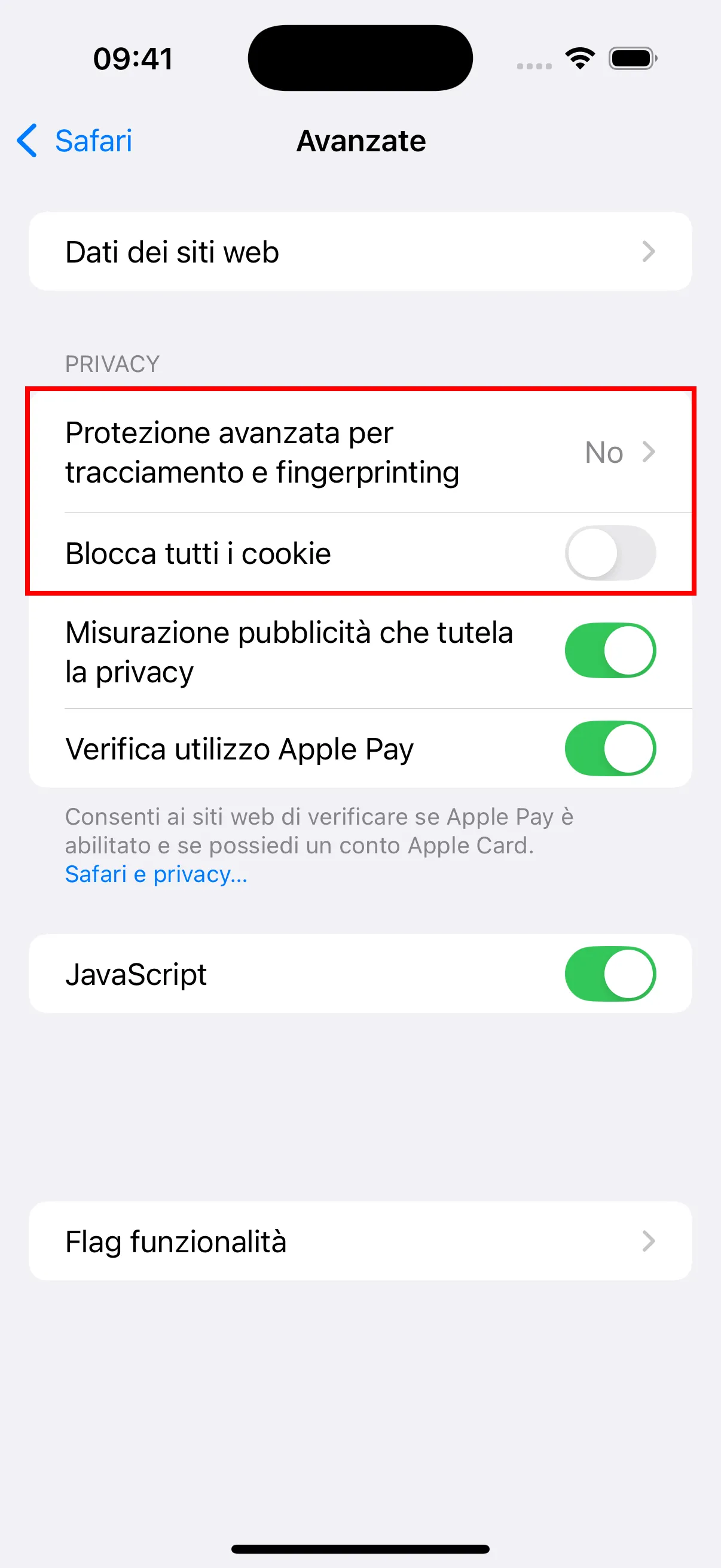 - Nelle impostazioni Avanzate, tocca “Protezione avanzata per tracciamento e fingerprinting” e impostala su No. Assicurati anche che “Blocca tutti i cookie” sia No.