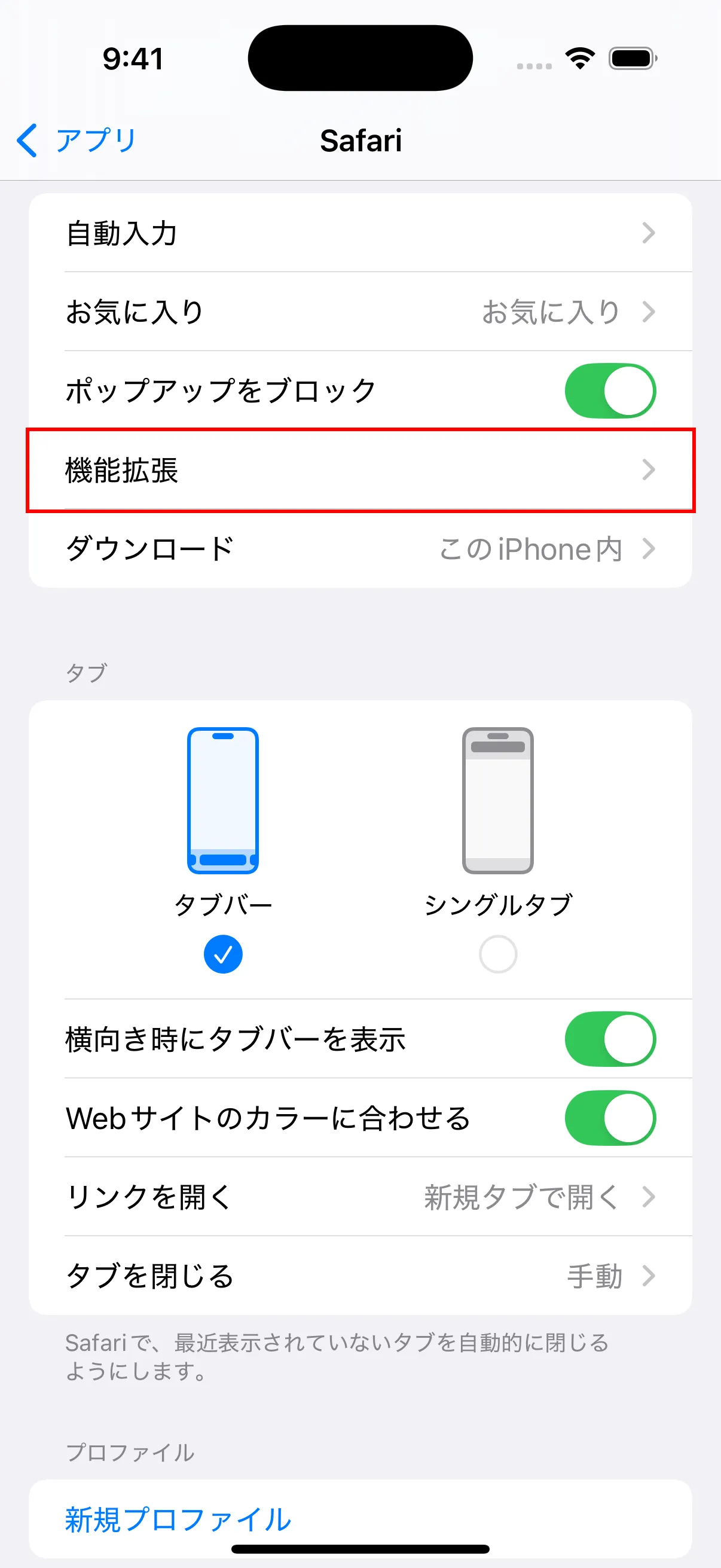 - Safariの設定に戻り、「機能拡張」をタップします。
