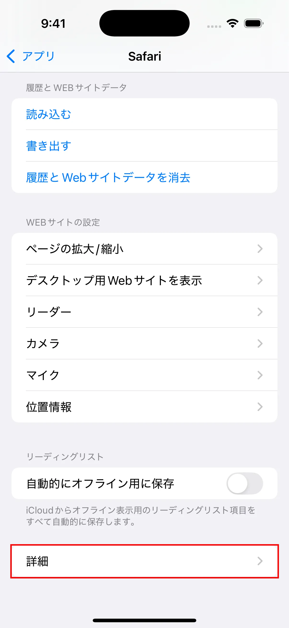 - 一番下までスクロールして「詳細」をタップし、詳細設定に入ります。