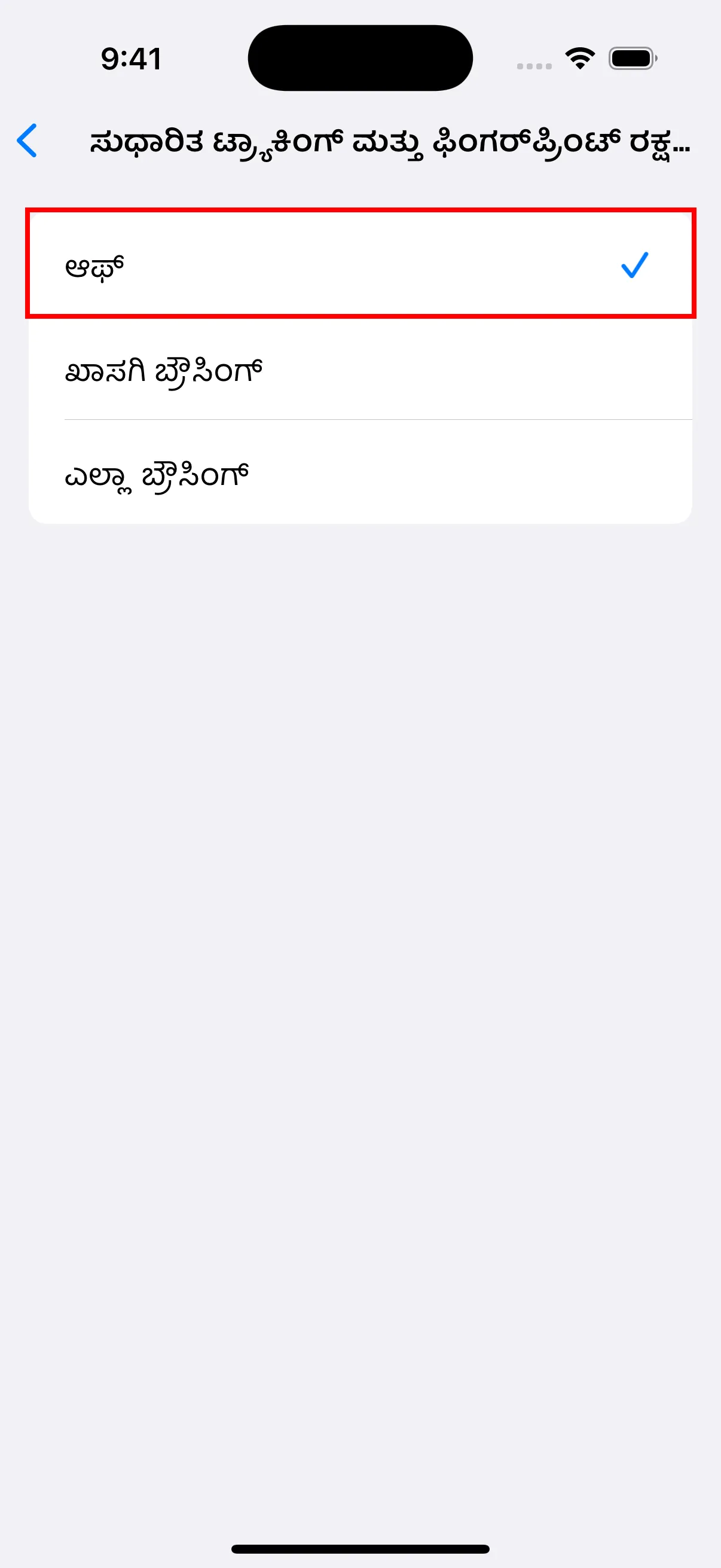 - ಸುಧಾರಿತ ಸೆಟ್ಟಿಂಗ್ಸ್ನಲ್ಲಿ, “ಸುಧಾರಿತ ಟ್ರ್ಯಾಕಿಂಗ್ ಮತ್ತು ಫಿಂಗರ್ಪ್ರಿಂಟಿಂಗ್ ರಕ್ಷಣೆ” ಟ್ಯಾಪ್ ಮಾಡಿ ಮತ್ತು ಅದನ್ನು ಆಫ್ ಗೆ ಹೊಂದಿಸಿ. “ಎಲ್ಲಾ ಕುಕೀಗಳನ್ನು ಬ್ಲಾಕ್ ಮಾಡಿ” ಸಹ ಆಫ್ ಆಗಿದೆ ಎಂದು ಖಚಿತಪಡಿಸಿಕೊಳ್ಳಿ.