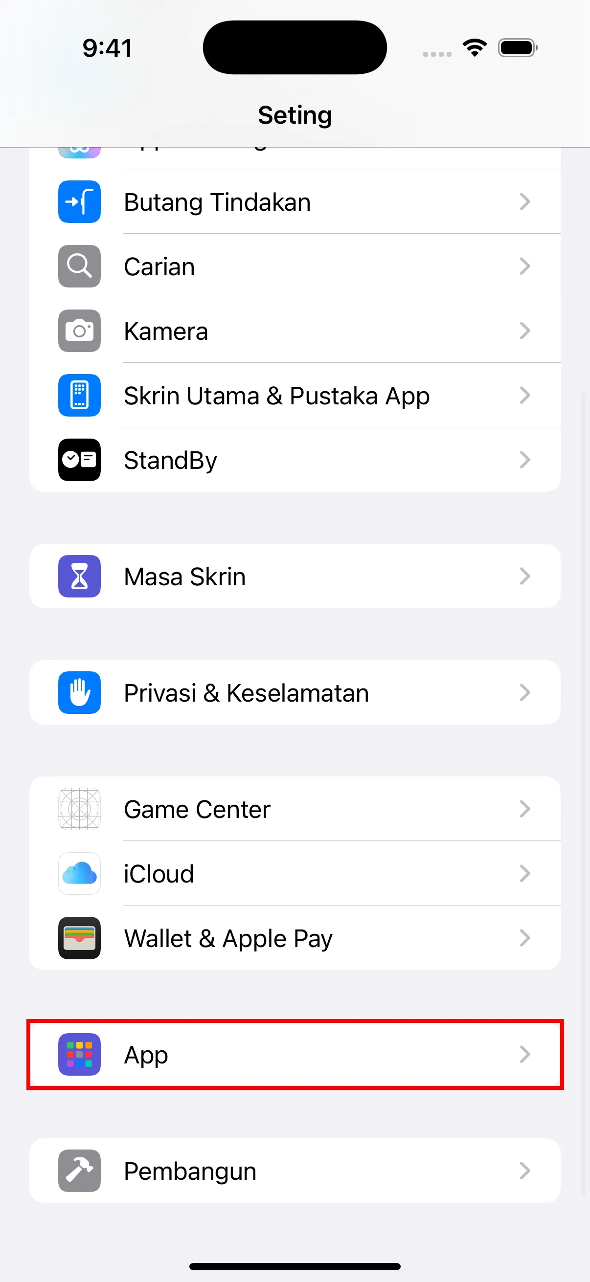 - Buka aplikasi “Settings” pada iPhone anda, tatal ke bawah untuk mencari “App” dan ketik untuk masuk.