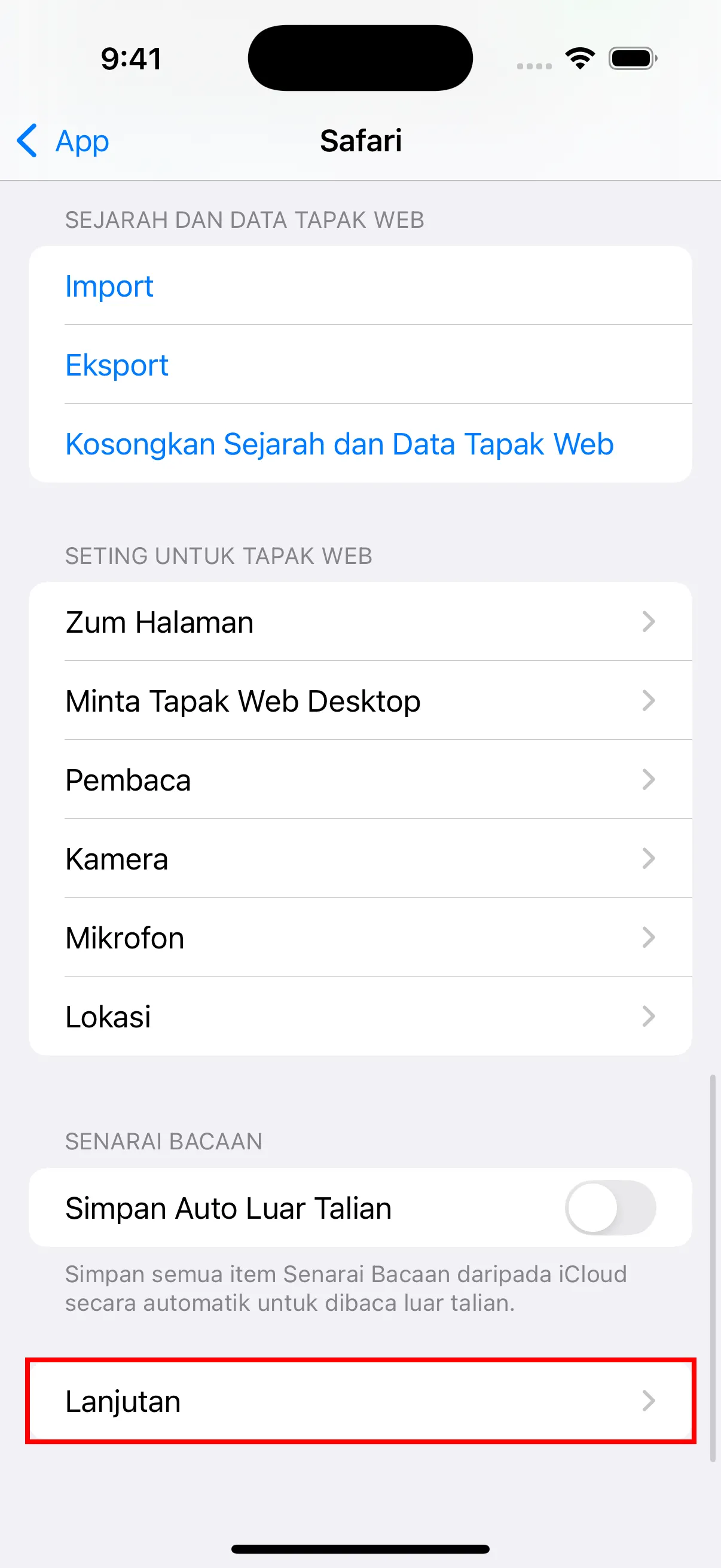 - Tatal ke bawah dan ketik “Lanjutan” untuk masuk ke tetapan lanjutan.