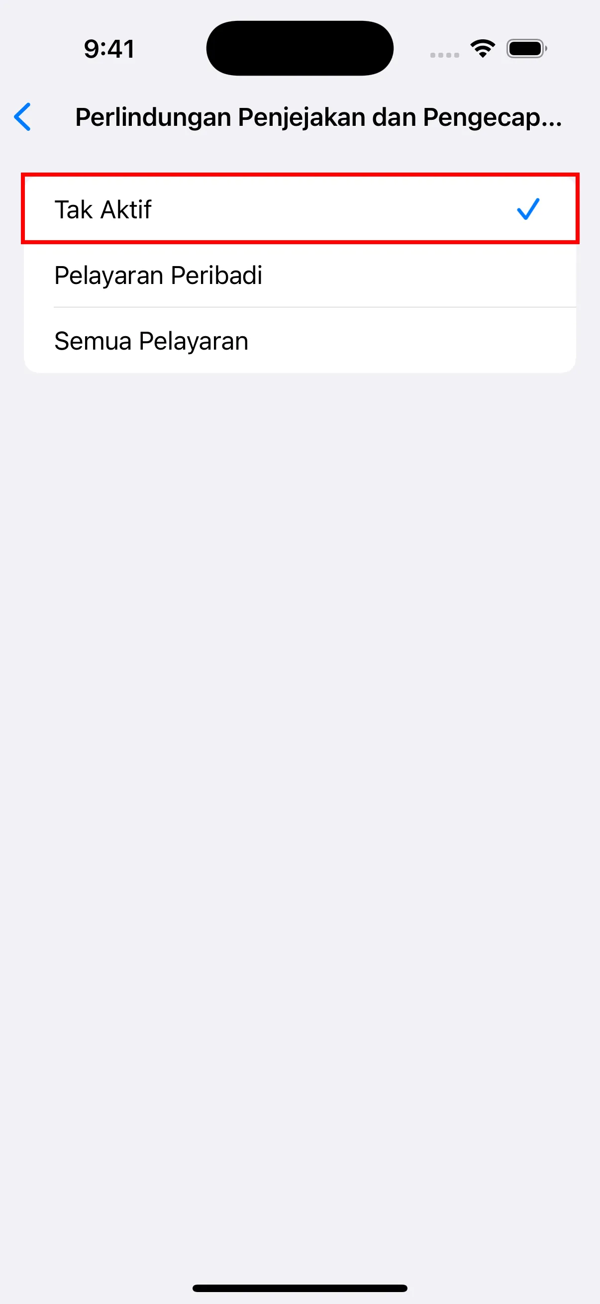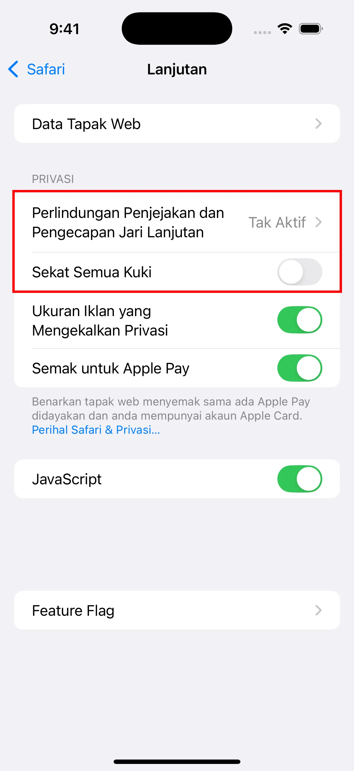 - Dalam tetapan Lanjutan, ketik “Perlindungan Penjejakan dan Pengecapan Jari Lanjutan” dan tetapkan kepada Tak Aktif. Juga pastikan “Sekat Semua Kuki” dimatikan.