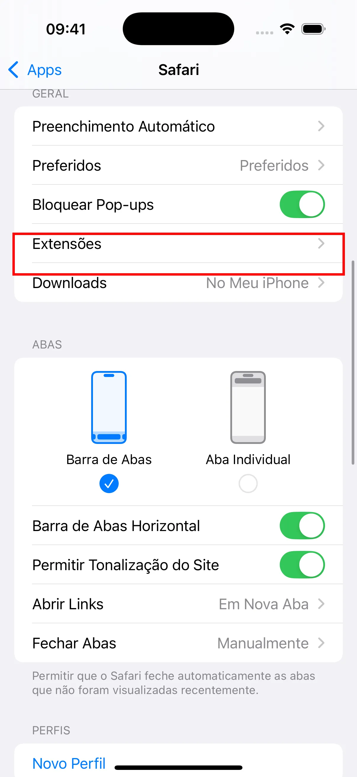 - Volte as configuracoes do Safari e toque em “Extensoes.”