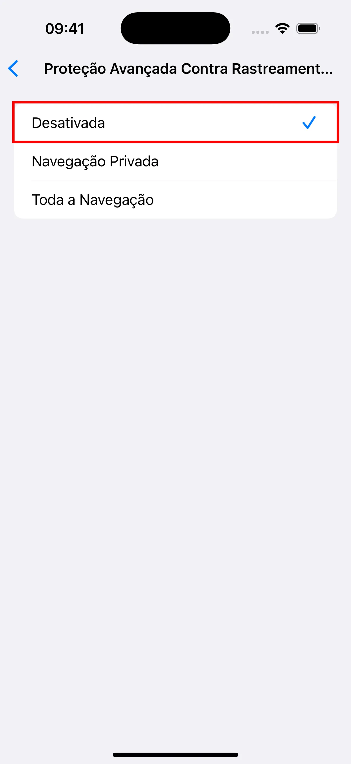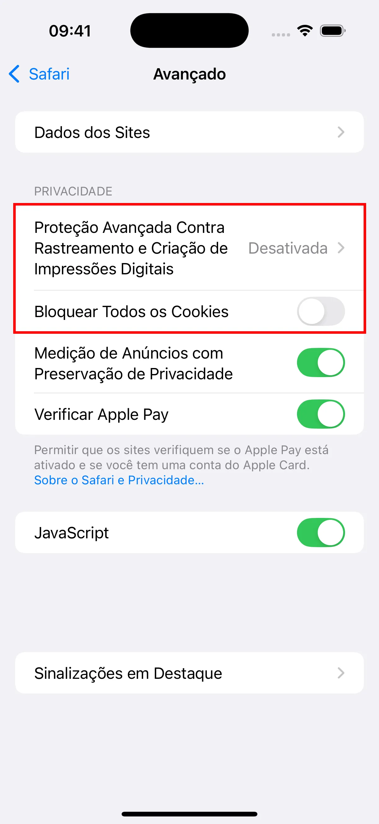 - Nas configuracoes Avancadas, toque em “Protecao avancada contra rastreamento e impressao digital” e defina como Desativada. Certifique-se tambem de que “Bloquear todos os cookies” esteja desativado.