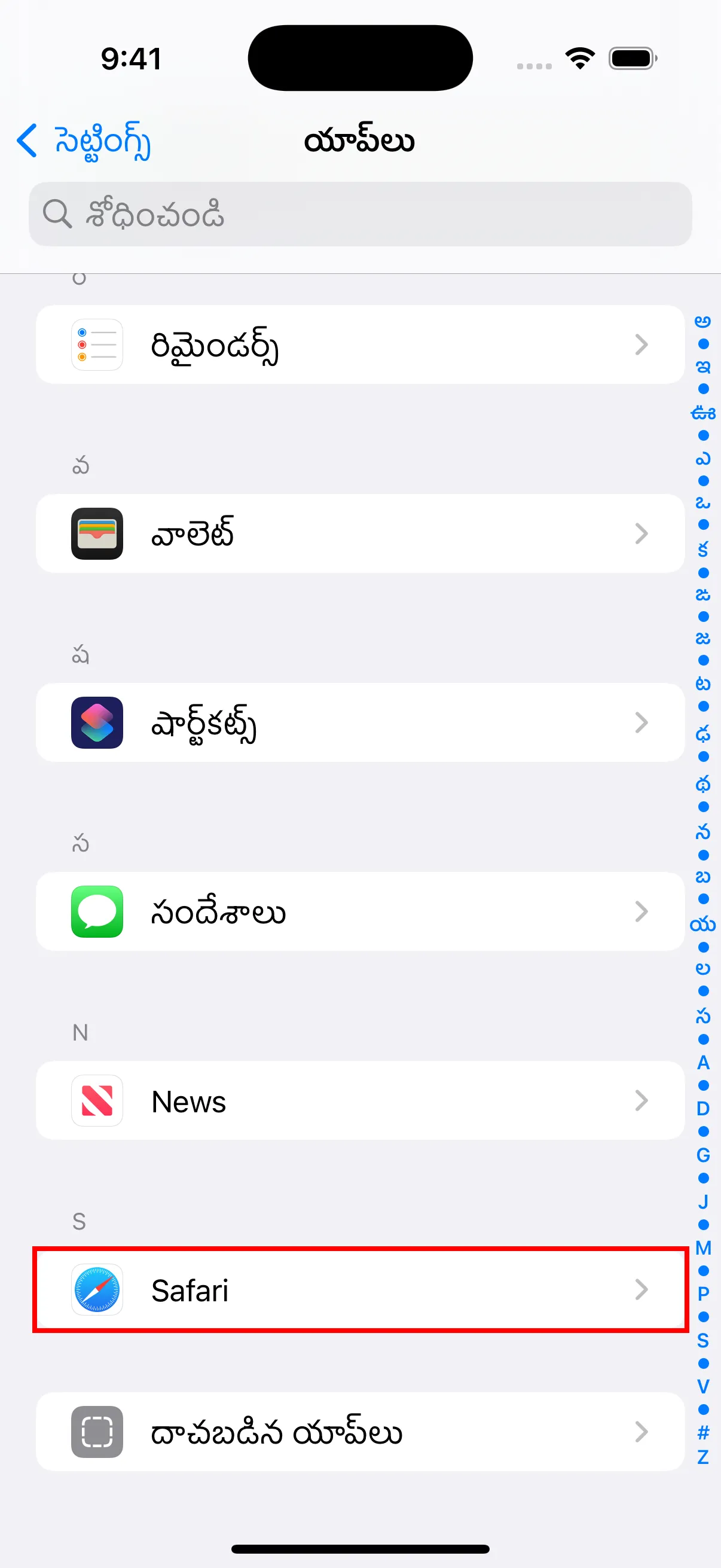 - యాప్ల జాబితాలో “Safari” కనుగొని ట్యాప్ చేయండి.