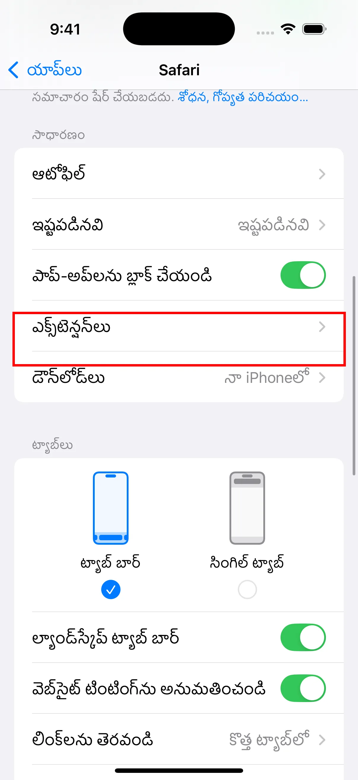 - Safari సెట్టింగ్లకు తిరిగి వెళ్ళి, “ఎక్స్టెన్షన్లు” ట్యాప్ చేయండి.