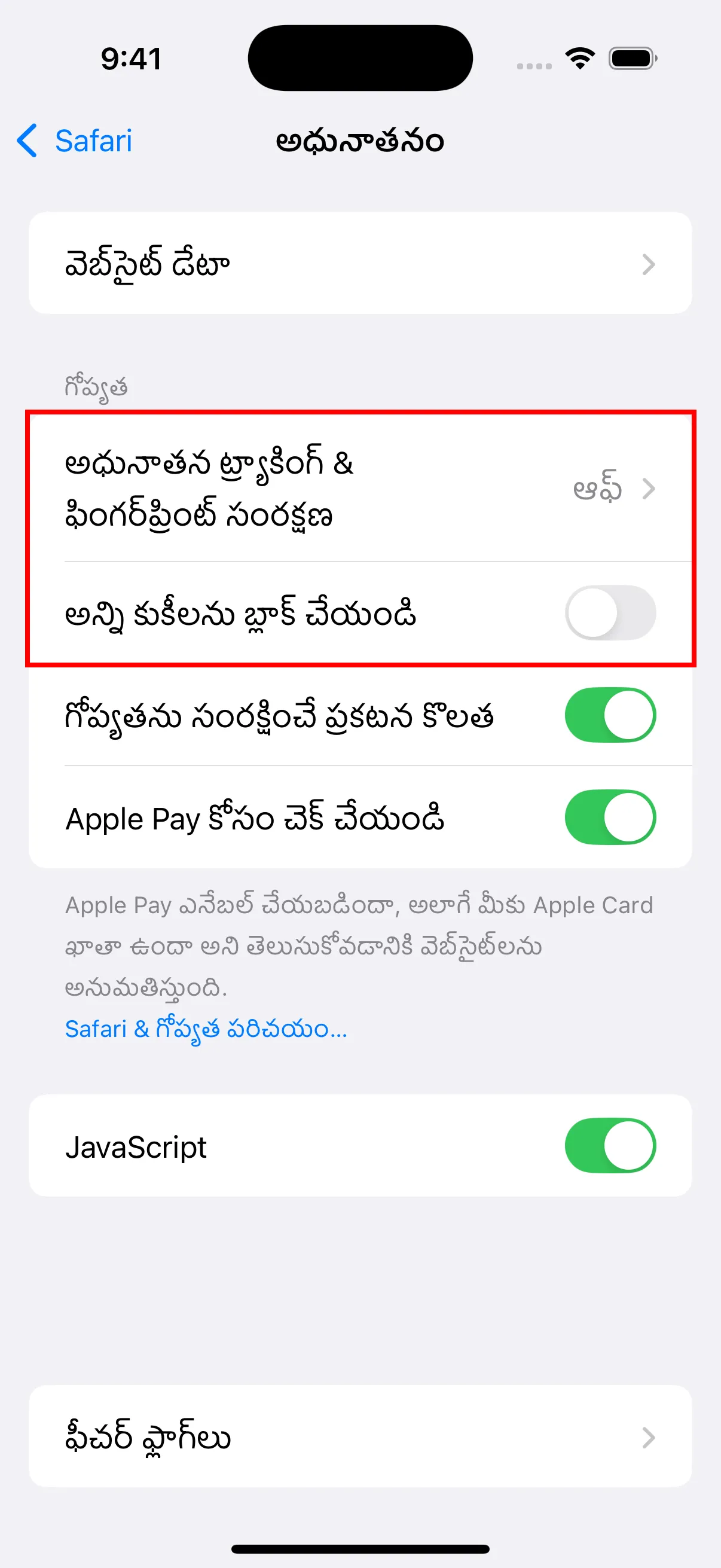 - అధునాతన సెట్టింగ్లలో, “అధునాతన ట్రాకింగ్ మరియు ఫింగర్ప్రింటింగ్ రక్షణ” ట్యాప్ చేసి ఆఫ్ గా సెట్ చేయండి. అలాగే “అన్ని కుకీలను బ్లాక్ చేయండి” ఆఫ్ అయినట్లు నిర్ధారించుకోండి.