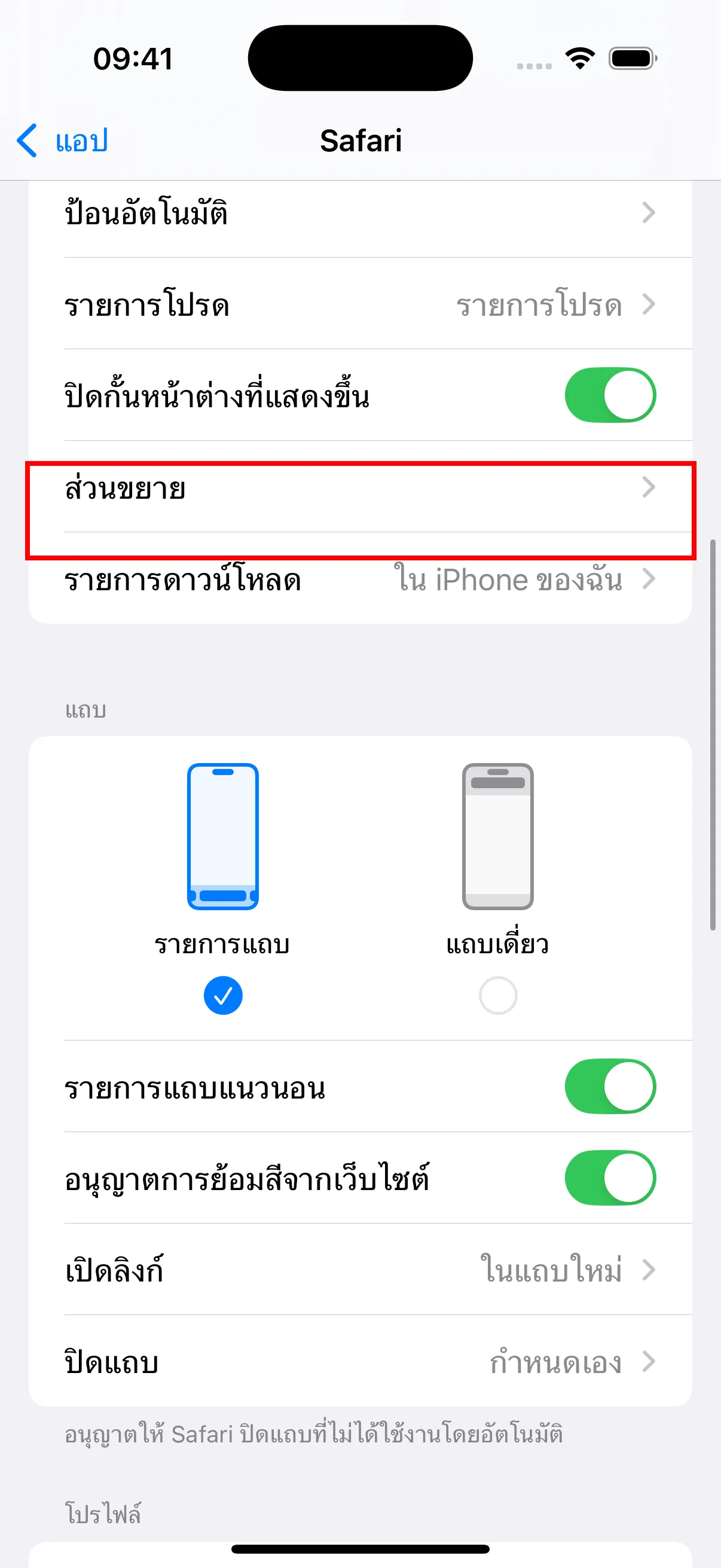 - กลับไปที่การตั้งค่า Safari แตะ “ส่วนขยาย”