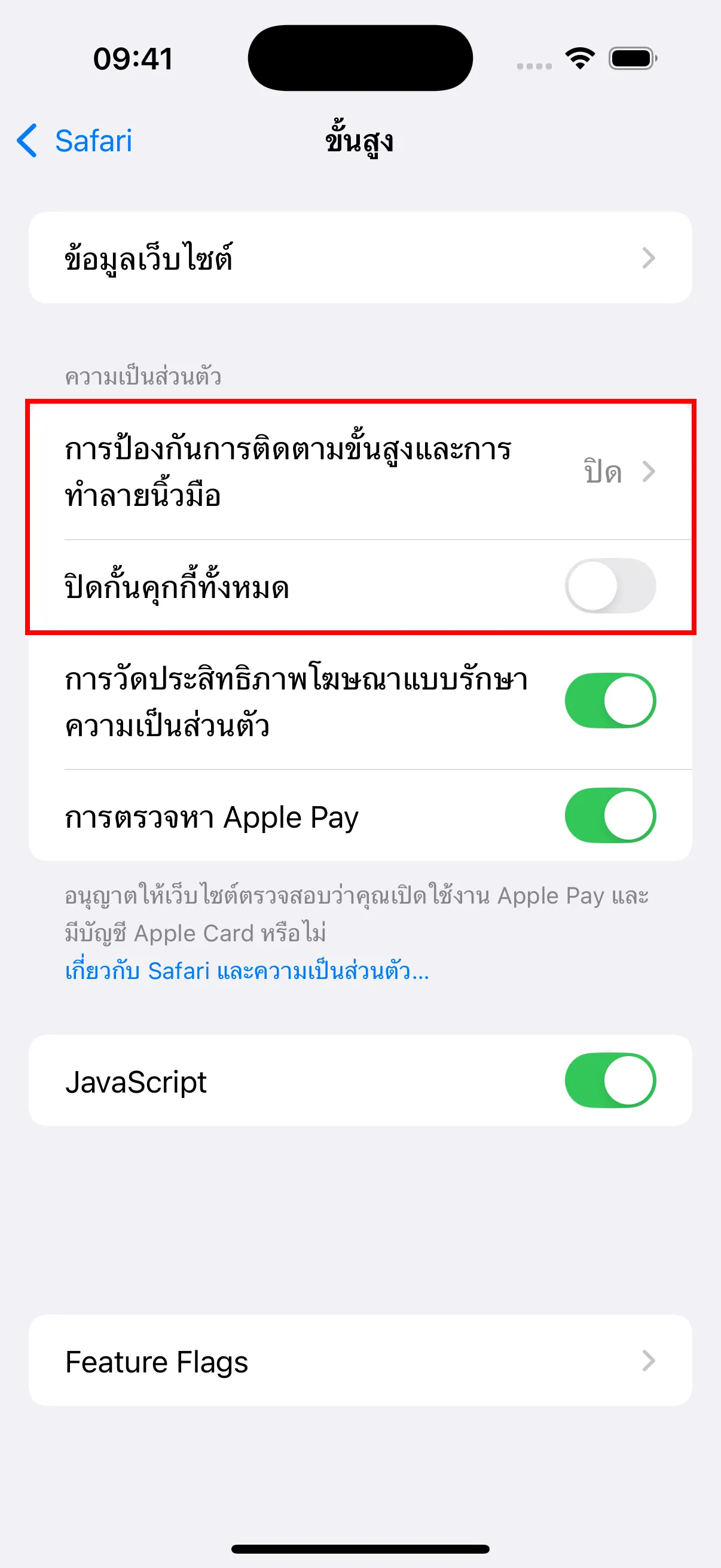 - ในการตั้งค่าขั้นสูง แตะ “การป้องกันการติดตามขั้นสูงและการทำลายนิ้วมือ” และตั้งเป็น ปิด นอกจากนี้ตรวจสอบให้แน่ใจว่า “ปิดกั้นคุกกี้ทั้งหมด” ปิด อยู่