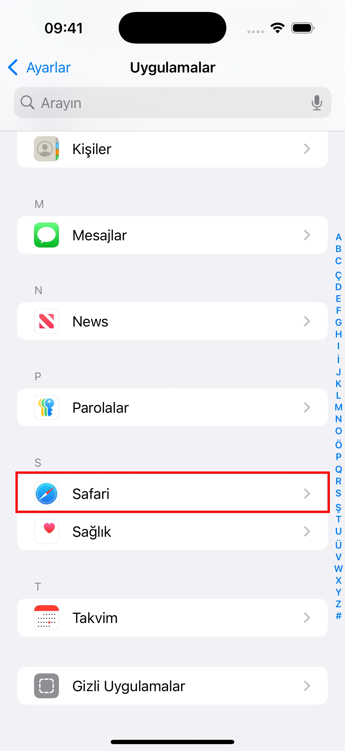 - Uygulamalar listesinde “Safari”yi bulun ve dokunun.