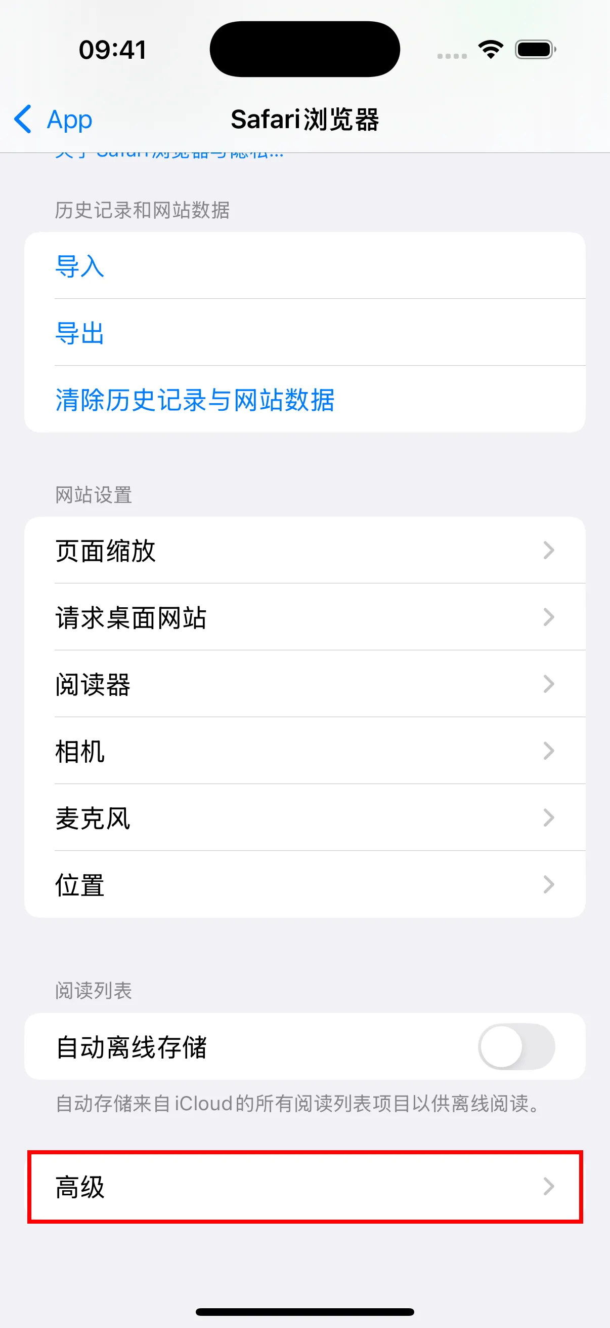 - 向下滑动到底部,点击”高级”进入高级设置。
