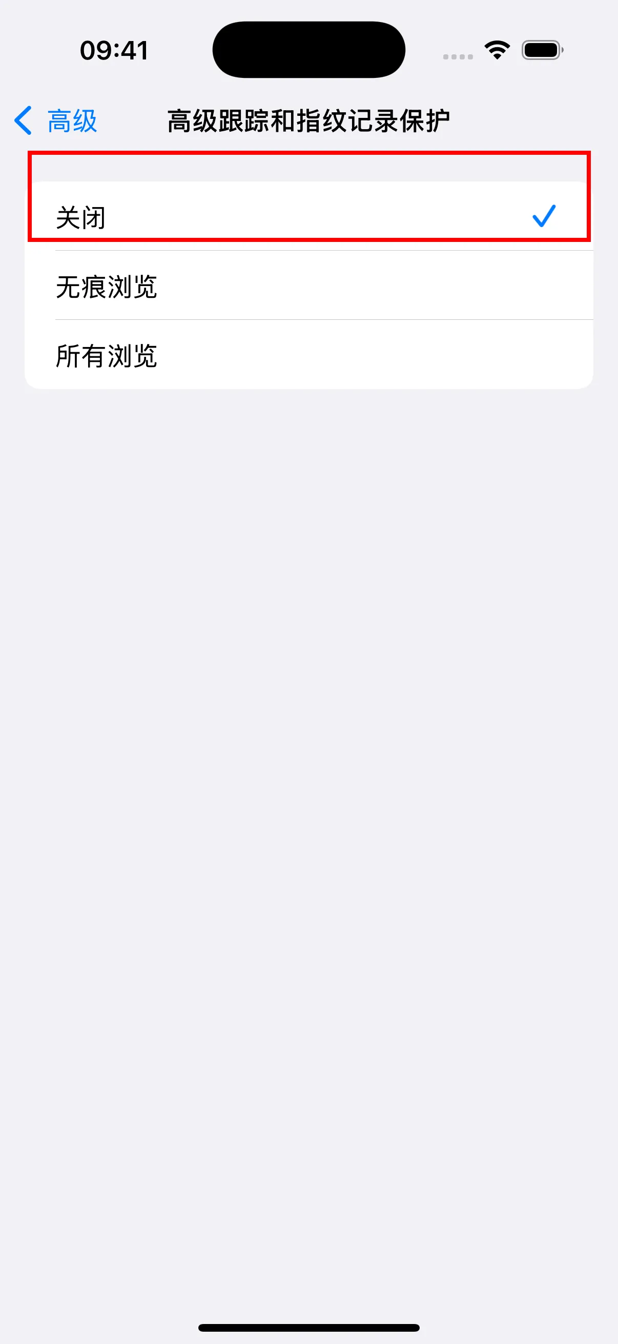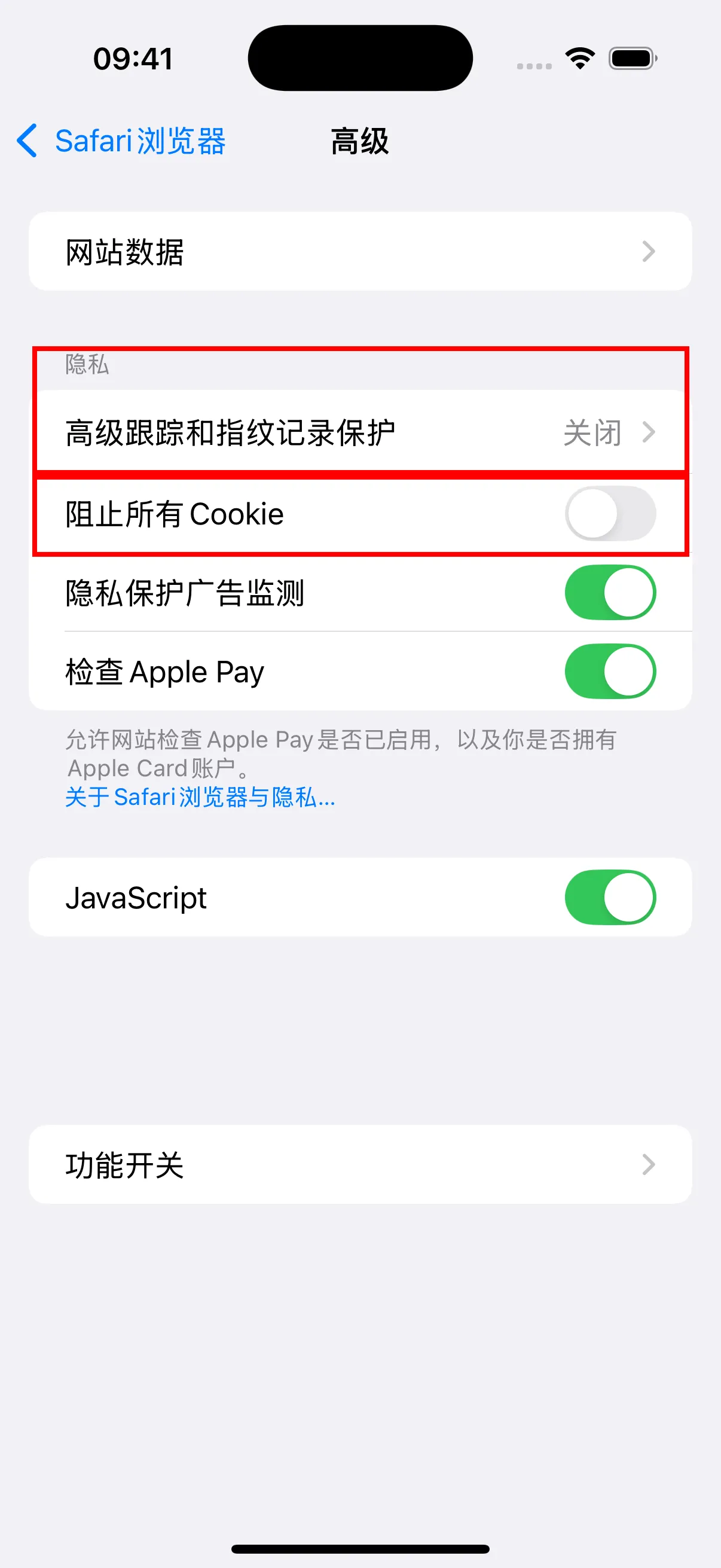 - 在高级设置中,点击”高级跟踪和指纹记录保护”,将其设置为关闭。同时确保”阻止所有Cookie”为关闭状态。